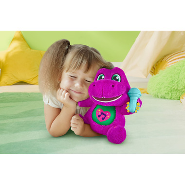 Sing-Along Barney plush is 10.5 inches tall! Kids can join in the fun and sing along! Barney starts singing with a press of his belly! Sing-Along Barney has 10 phrases and 5 sing-along songs! Encourages imaginative storytelling for toddlers and preschool kids ages 2 years and older.