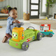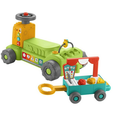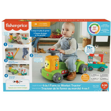 Your baby can ride, park, and roll into farm-fresh pretend play with the Laugh & Learn 4-in-1 Farm to Market Tractor ride-on learning toy from Fisher-Price. This interactive toy tractor with pull-along market wagon has fun lights, music, and 4 ways to play as your little farmer grows from infant to toddler. Switch up the learning as your baby grows with 3 Smart Stages levels that teach the alphabet, counting, shapes and more. Requires 3 AA batteries (not included). Use the globe button to select a language: English or French.