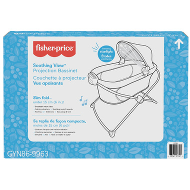 The Fisher-Price Soothing View Projection Bassinet is the perfect cozy spot for your baby to get their snooze on, at home or on the go. This portable cradle gently rocks and features calming vibration, music and sounds to help soothe baby to sleep. Unfold the soft canopy overhead, and baby will be mesmerized by two hanging toys and a starry light projection. When it's time to go, the bassinet's super-slim fold makes it easy to take along or stow away. Use only with a child who is unable to push up on hands and knees, pull up or sit unassisted.