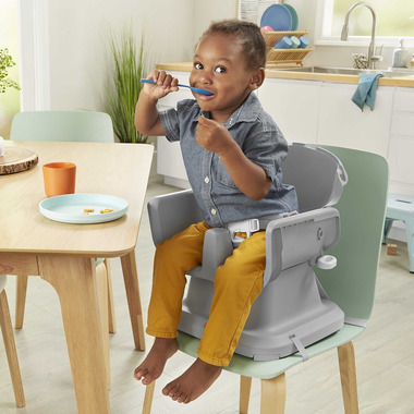 The Fisher-Price SpaceSaver High Chair is a portable dining seat that packs all the features you love from a full-size high chair into half the space. Adjust the seats recline and tray position to keep your baby comfortable, and then transform it into a toddler booster when your tiny diner is ready. The deep-dish tray design helps keep baby from pushing food off the tray, and the spill-resistant seat pad and harness are machine washable for easy cleaning.