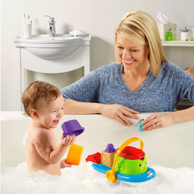 Little mates will love tub time with a floaty boat, a squirt n' swim fish (it really floats too!) and three stack & nest cups for scooping, straining and pouring fun! Baby can spin the paddle wheel-and play peek-a-boo with the octopus, too. All play pieces fit neatly on deck, with a convenient handle to hang it on the tub spout for easy drain & store. And everything floats!