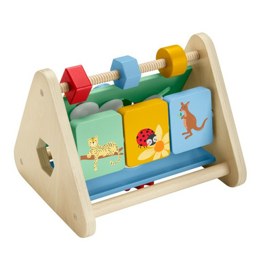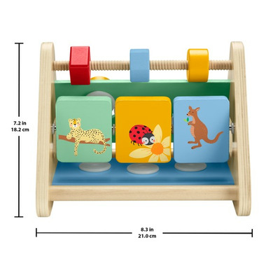 - Animal-themed wooden activity triangle toy with 2 sides of hands-on fun
