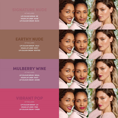 Earthy Nude Kit includes: Lip Colour Serum “Halo”, Vegan Lip Liner “Root”, Lip Colour Cream “Rooted”. Kit includes all full sized products