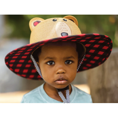 Make a splash with this pint-sized version of the on-trend lifeguard hat featuring an adorable twist: darling bear ears and face! The wide brim, lined with smart buffalo check plaid, provides full coverage for sun-soaked days while an adjustable chin strap ensures the hat doesn't fly away with the wind. Lightweight, packable and providing UPF 50+ protection, this sun hat is the perfect companion for all summer adventures!