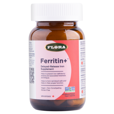 Many healthcare providers recommend taking an iron supplement if you're low on this essential mineral. But form matters. Enter Ferritin+, a plant-based ferritin-iron extracted from organic peas. Ferritin is a naturally protein-coated form of iron found in legumes that allows for controlled release and efficient absorption, which helps to minimize digestive upset. Flora's clinical studies have shown that plant-based ferritin iron can effectively increase and maintain healthy iron levels.