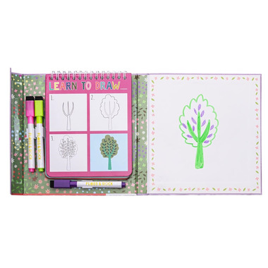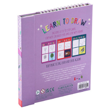 Our Learn to Draw includes 3 colour dry wipe pens with eraser lids and 8 step by step picture cards teaching you to draw. The pictures are spiral bound and easy to flip to the next one, with an empty page for you to make your masterpiece!