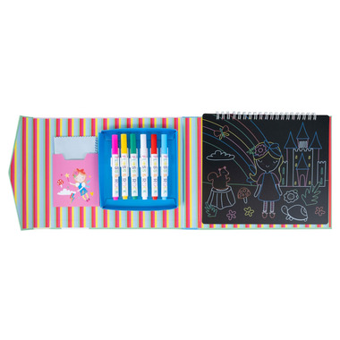 This brilliant Chalk Board Sketchbook contains 5 pages with ready to colour-in illustrations plus 3 plain pages for doodling! There's a removable tracing and stencil sheet too! The sketchbook comes with 6 coloured chalk pens and a handy cleaning cloth to wipe the pages clean when you're finished.