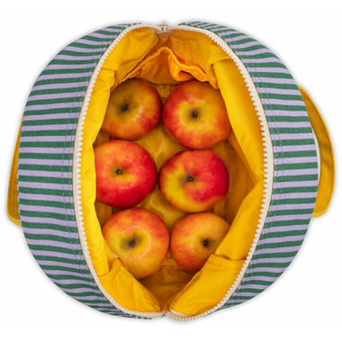 Deceptively roomy lunch bag that packs flat. Safe and non-toxic. Fully machine washable. Rinseable, tested food-safe lining to contain light spills. Interior pocket (for water bottle or ice pack). Sustainably and ethically made with organic + recycled materials.