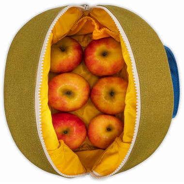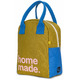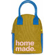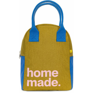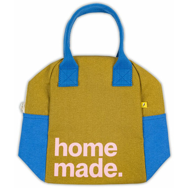 Deceptively roomy lunch bag that packs flat. Safe and non-toxic. Fully machine washable. Rinseable, tested food-safe lining to contain light spills. Interior pocket (for water bottle or ice pack). Sustainably and ethically made with organic + recycled materials.
