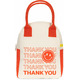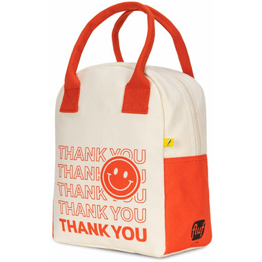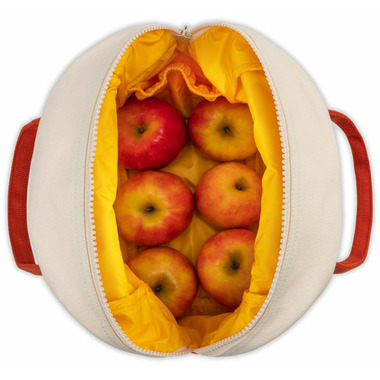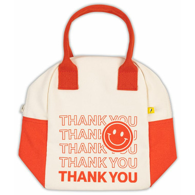 Deceptively roomy lunch bag that packs flat. Safe and non-toxic. Fully machine washable. Rinseable, tested food-safe lining to contain light spills. Interior pocket (for water bottle or ice pack). Sustainably and ethically made with organic + recycled materials.