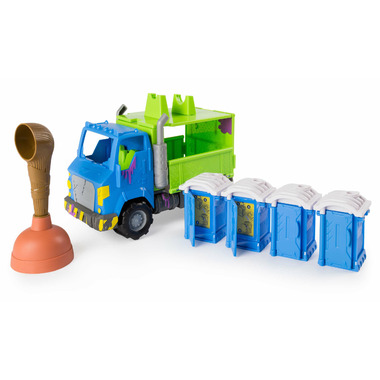 Take your filthy Flushies on the road with the Potty Wagon! This port-a-playset is the grossest way to drive your mutants around Flushville! Carrying a total of four port-a-potties, two port-a-potties have filthy Flushies hidden inside, just waiting to climb out and surprise you!