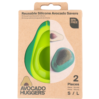 This set of two Avocado Huggers fit over half avocados to keep them fresh longer. These customized Food Huggers are specifically designed for the best preservation of avocados. Two sizes help make sure you are prepared for avocados large and small. Avocado Huggers come with a pit pocket that can be pushed in or out depending if the half you are saving has a pit.