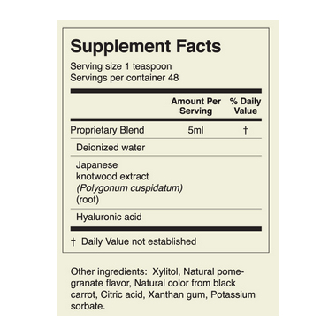 Ingredients: Water, sweetener xylitol, resveratrol complex (hydroxypropyl-beta-cyclodextrin, polygonum cuspidatum extract, beta-cyclodextrin), natural flavour, colour black carrot, preservative citric acid, thickener xanthan gum, preservative potassium sorbate, hyaluronic acid.