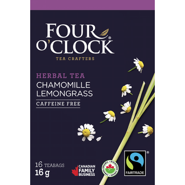 At Four O'Clock , they raise their cup often. They raise it to the health of the planet and those who cultivate its bounty using fair and organic practices. Four O'Clock's Chamomile, lemongrass: Fairtrade Standards, total 100%. Naturally Gluten-Free.