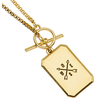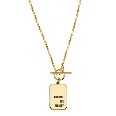 Fall in love with the process. The charm on this toggle box chain necklace is engraved with "Embrace the Journey" on one side and a compass on the reverse side. Wear it as an empowering reminder to accompany you everywhere you go. Foxy's Embrace the Journey Necklace in Gold is handmade from fine pewter and is plated in 14 karat gold.