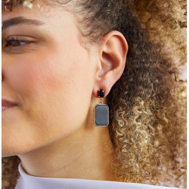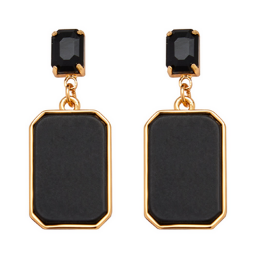 Whether its a holiday party or fancy dinner date, make sure these earrings are your plus one. Rectangular black resin pendants hang from shimmering faceted stones.