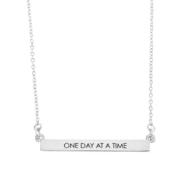 One Day At A Time Bar Necklace is handmade from fine pewter and is plated in Silver. All Foxy jewelry is lead free.