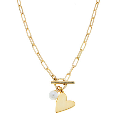 These hearts are set on this long link chain and toggle necklace. The heart and pearl charm are sure to stand out on their own. Foxy's Rosie Necklace in Gold is handmade from fine pewter and is plated in 14 karat gold.