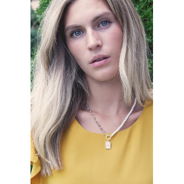 The mixed vibe of glass pearls and statement style chain creates a modern yet classy aesthetic.