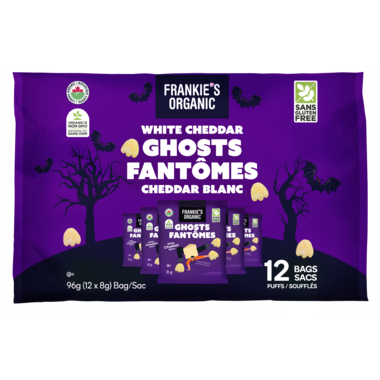 Frankie's White Cheddar Ghosts are are the ultimate Halloween treat! They are organic snacks made with sprouted grains (quinoa and rice) providing flavour and texture that makes this product stand out. These Clouds are certified Organic in Canada & USDA Organic, as well as Non-GMO Project Verified, Whole Grain Council Approved and CCA Gluten-Free Certified. Made in Canada.