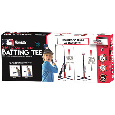 The Franklin Future Champs MLB 2-in-1 Grow-with-Me Baseball Tee is designed for first-time athletes learning to play teeball or baseball. The set is engineered to offer a 2-step process to truly train as you grow. Kids start with the beginner Hanging Baseball Tee, and eventually work their way up to the Traditional Baseball Tee Trainer. The Hanging Ball Tee suspends the ball 18" to 26" from the ground for smaller, first-time players. Simply attach the baseball to end of the hanging arm using self-stick technology and swing away! The hanging design is perfect for teaching young players how to swing while improving hand eye coordination! Once younger players gain confidence and start to grow, the hanging arm can be removed and replaced with the traditional ball tee topper in seconds. The traditional style tee adjusts from 25" to 36" so young players can continue to practice as they grow! The set comes with (1) 21" plastic bat and (4) baseballs with self-stick covers so you have everything you need to get the game started. Start helping your young slugger learn the game today with the MLB Grow-with-Me Batting Tee!