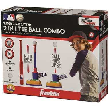 The Franklin Future Champs MLB Super Star Batter 2 in 1 Tee Ball Combo offers two fun ways for kids to learn to play baseball! Kids start by hitting from the tee. Once confidence is gained, simply remove the tee attachment to reveal the "pop up" function. Step on home plate to set the pitch, then release using the 1st base or 3rd base buttons. Perfect for both right and left handed hitters! Young athletes are sure to improve hand eye coordination skills as they play. The set comes complete with (1) 2 in 1 Tee Ball & Pop a Pitch Combo, (1) 22" collapsible telescopic baseball bat and (3) AERO STRIKE plastic baseballs to get the game started!