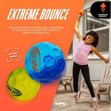 Bounce out of this world with the NERF Extreme High Bounce Ball! Perfect for indoor and outdoor games, this super bounce ball is perfect for playing a variety of games and sports and is durable enough to last year after year. Capable of bouncing up to 50 feet in the air, this super bounce ball is a perfect gift for any kid to get outside and launch the ball as high as they can. The vibrant colours make them easy to track, catch and throw no matter how high they bounce! Play catch, baseball, tennis, pickle and a variety of other sports games with a fun added twist! This super bounce ball is the perfect toy to help kids get active and outdoors for exercise and fun! So if you're ready to bring your outdoor games to the next level, grab yourself the NERF Extreme Bounce Ball and staring bouncing today!