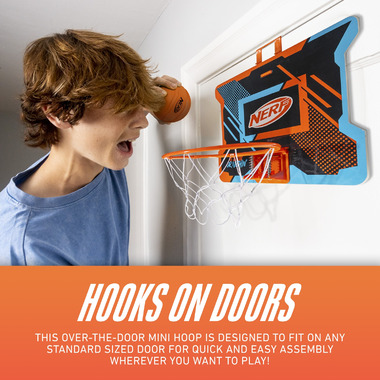 Bring all the fun of basketball indoors with the NERFOOP Slam Mini Over the Door Basketball Hoop Set! This all-in-one indoor mini basketball hoop set has everything kids need to get the game started right in their very own bedroom. This toy basketball set comes with 1 over the door kids basketball hoop and 1 mini NERF foam basketball so kids can play right out of the box. Simply hang the mini hoop over any standardized door and you're ready to play in seconds. This classic hoop has been upgraded with a spring loaded rim and plastic backboard for a more premium feel. Plus the soft foam 3.5" inch mini basketball is fun indoors so kids can play worry free. So if your kid is looking to bringing some basketball excitement to their room, grab them the NERFOOP Slam Mini Over the Door Basketball Hoop Set and start the game today!