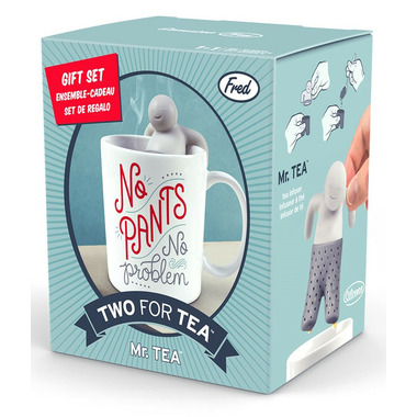 Fred and Friends Two for Tea Mr. Tea Gift Set includes a Mr. Tea infuser and coordinated mug. Mr. Tea's knows how to relax, his motto is no pants, no problem. You will brew the prefect cup of tea every time!