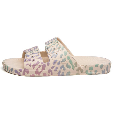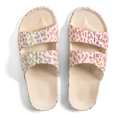 Freedom Moses is all about celebrating summer 365 days a year. From AM to PM, Freedom Moses Vegan Kids Slides are injected with air so you feel like you're walking on a cloud. Whether chilling at the beach or just hanging out, they're also available for your whole crew, from kids slides to women's slides and men's slides, if you're into prints, glitters, metallics or basic colors we've got you covered.