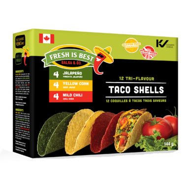 Fresh Is Best Tri-Flavor Taco Shells are so fresh and crispy that you will not want anything else on Taco Nights. Made in yellow corn, jalapeno and chili flavors (4 of each flavor). Try some today! Made in CANADA.