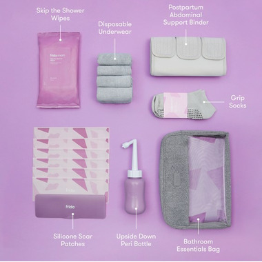 • INCLUDES 1 Upside Down Peri Bottle for bathroom trips, 4 Disposable C-Section Postpartum Underwear, 1 Postpartum Abdominal Support Binder, 10 Skip The Shower Wipes, 4 Silicone Scar Patches. Plus, keep it all together in the included Bathroom Essentials Bag and comfy Grip Socks.
