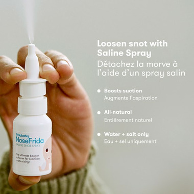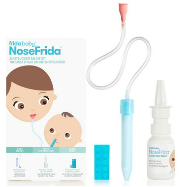 Keep your little one's nostrils clear naturally with the Fridababy NoseFrida Saline Kit, the all-in-one stuffy nose solution for babies. Includes the Snotsucker nasal aspirator, disposable hygiene filters, and the NoseFrida Saline Snot Spray.