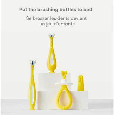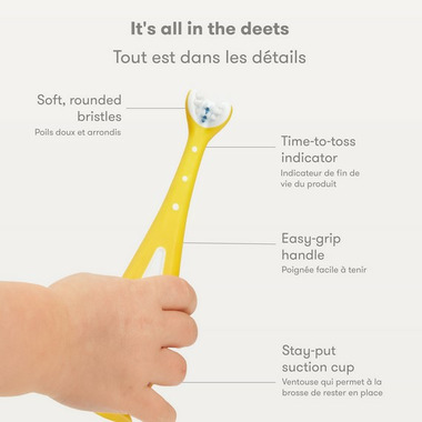 Your kiddo has graduated from the Training Toothbrush for Babies to a mouth full of baby teeth. It's time to level-up their oral care game and start practicing good oral hygiene with the Training Toothbrush for Toddlers. Equipped with triple-angle bristles which clean all sides of their teeth at once, this toothbrush makes brushing their teeth take a shorter amount of time than a traditional toothbrush. The stay-put suction cup keeps the brush from rolling off countertops, while the easy-grip soft silicone handle is easy to maneuver for toddlers and parents - so you can make sure the job really gets done. Build healthy oral health habits with the entire oral care line from Frida Baby.