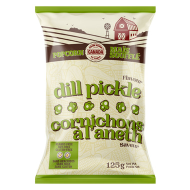 Whole grain popcorn, Oil (vegetable oil and/ or canola oil and/ or sunflower oil), Seasoning (modified milk ingredients, sugars [maltodextrin, sugar], Salt, Sodium diacetate, Yeast extract, malic acid, Spice extract, Garlic powder, Dill weed). Contains: Milk, Milk ingredients.