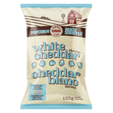 Whole grain popcorn, Seasoning (modified milk ingredients, salt, sugars [maltodextrin, dextrose], white cheddar cheese powder [modified milk ingredients, chaddr cheese 9milk ingredients, bacterial culture, salt, rennet and/ or pepsin and/ or microbial enzyme, may contain calcium chloride0, modified palm oil, salt, disodium phosphate, lactci acid], flavours [contains milk], lactic acid, nutritional yeast), OPil (vegetable oul and/ or canola oil and/ or sunflower oil).