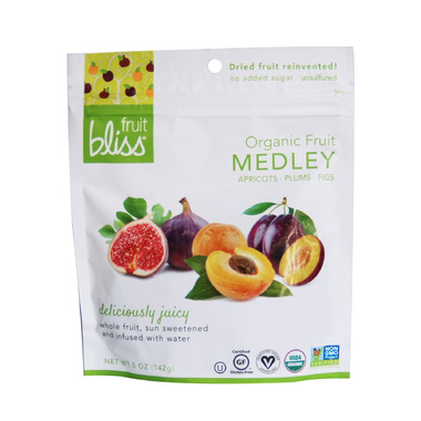 Fruit Bliss Organic Medley contains the fruits: Apricots, Figs & Plums. All your favourites in one convenient bag