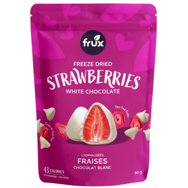 Frux White Chocolate Freeze-Dried Strawberries are made with whole strawberries that are carefully freeze-dried to keep their natural flavor and crunch. Each piece is then coated in smooth white chocolate, creating a sweet and crispy treat that blends fruity freshness with creamy chocolate sweetness. Perfect for snacking, sharing, or enjoying anytime.