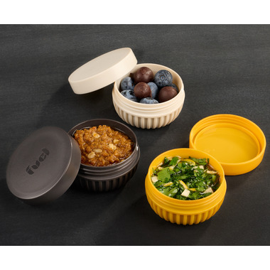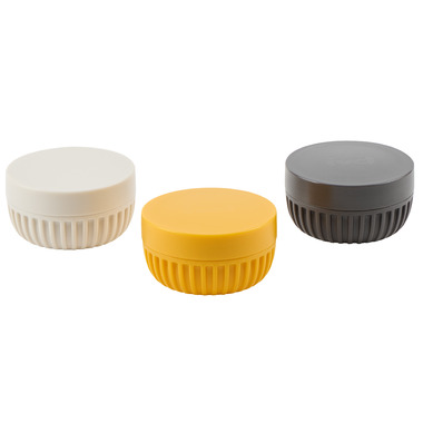 At 2 full ounces per container, the Trudeau set of 3 Fuel Mini Bowls are the perfect size to complement a packed lunch. Fill them with roasted almonds for a quick boost of energy, with dips for a veggie snack or condiments, such as ketchup or spicy mayo, to complete a meal. The simple twist off lid is easy to open and seals tightly to prevent any spills or leakage. The Mini Bowls fit well within the 4 container size variations of our Fuel Dinnerware Collection. The set of 3 is great for everyone, kids and adults alike!