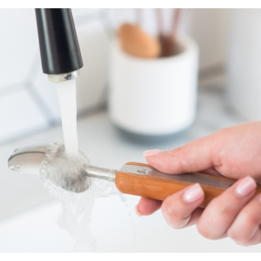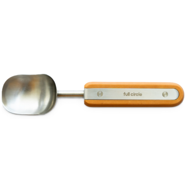 Full Circle's Ice Cream Scoop in stainless steel. Thin, spade-like edge carves through the hardest of ice creams without the hard work. This sustainable line of stainless steel gadgets has uniquely engineered handles made of bonded kraft paper and fortified with food-safe resin making them as hard as wood, naturally antibacterial, and dishwasher safe.