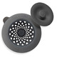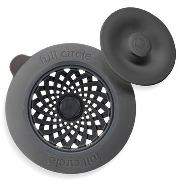 Sink Strainer, with pop-out stopper, 4.5" / 11.5cm dia, grey, plastic and recycled plastic. Fits most sinks and is more effective than twist-close stoppers. Pops on top of the strainer when you need to fill your sink, and the strainers tab makes it easy to remove from the drain, even when the sink is full. Simply invert the basket to empty it, and your fingers never have to touch ғthe yucky stuff.