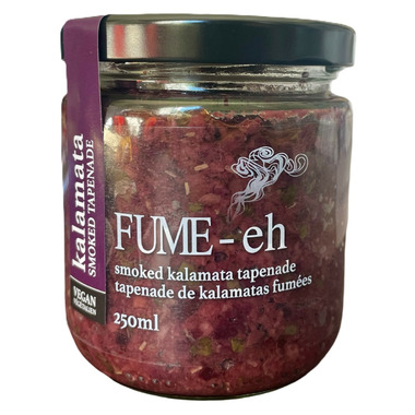 FUME-eh Smoked Kalamata Olives, Extra-Virgin Olive Oil, White Balsamic Vinegar, Lemon Juice, Capers, Garlic, Parsley