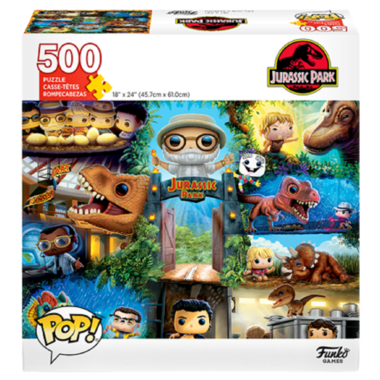 Watch your favorite pop culture characters take shape as you put together 500 pieces of fun! This 18” x 24” puzzle uses high-quality materials and vibrant Pop! styled artwork. It’s perfect puzzling for the whole family, featuring an original illustration inspired by the celebrated film, Jurassic Park.