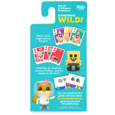 A fast-paced, light card game for the whole family! Featuring a collectible SpongeBob SquarePants Pop! figure, as well as your favorite characters from the beloved television show. Power Cards add fun new twists to the classic card gameplay. Combine with other Something Wild! games to add more characters, Pop! figures, and Powers to your game!