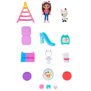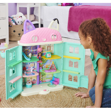 Play inside your own dollhouse world with Gabby's Dollhouse Purrfect Dollhouse! Standing over 2ft. tall, this fantastical kids dollhouse is packed with exciting features to discover, including a Dollhouse Delivery tower, working Cat-A-Vator, sounds and so much more! With a 3.5-inch Gabby Girl collectible figure, Pandy Paws figure, furniture for each room, three accessories and two Dollhouse Deliveries, you can get straight to the fun right out of the box. Just like in the show, drop a delivery in the tower and press the button to retrieve it unbox it to find a surprise accessory inside! Open the dollhouse and press the button on the front to hear songs, sounds and phrases from the show! With so many rooms and surprises to explore, use your imagination to play out endless adventures with Gabby and her best pal Pandy Paws. Relax on the music room's colorful couch and open the door on the tree to reveal a guest on the room's backdrop. Hungry? Flip the table in the kitchen to turn it from breakfast to dinner! Take a ride in the Cat-A-Vator and slide it up to reach each floor. Help Gabby wash her hands at the bathroom sink or find a colorful surprise in the toilet; let Pandy Paws get some rest under the play tent in the bedroom; get creative on the craft room?s easel and have fun on the playroom's slide. When you reach the top floor, flip the roof back and play in the attic! Add more rooms to your toy house with the Deluxe Rooms (each sold separately) slide the rooms directly into the dollhouse's walls! For easy storage after a fun-filled day of pretend play, Gabby's Purrfect Dollhouse can close up with or without the Deluxe Rooms inside.