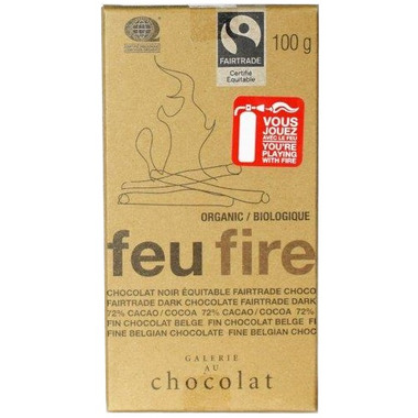 Dark Chocolate Fire Bar, both Fair Trade and Organic, by Galerie au Chocolat. 72% cacao. Made in Canada.