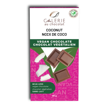 Indulge in Galerie au Chocolat's Vegan Milk-less Chocolate with Toasted Coconut. This bar is rich, smooth and as decadent - as you would expect from Canada's most loved premium chocolate-maker! But there are no dairy ingredients in this creamy "milk chocolate." Chick Pea Protein is the secret ingredient.