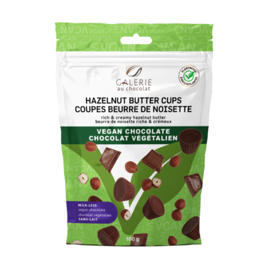 Indulge in Galerie au Chocolat's Vegan Milk-less Chocolate Hazelnut Butter Cups. This chocolate is rich, smooth and as decadent as you would expect from Canada's most loved premium chocolate-maker! But there are no dairy ingredients in this creamy "milk chocolate." Chick Pea Protein is the secret ingredient.