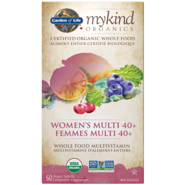 Here’s a whole food multi from real, nutritious foods that’s Certified USDA Organic, Non-GMO Project Verified and is specifically formulated for the needs of women 40+—mykind Organics Women’s 40+ Multi. Made from over 30 powdered organic fruits, vegetables and herbs, mykind Organics Women’s Multi 40+ is brimming with 20 vitamins and minerals, 16 with greater than 100% Daily Value (DV). It also offers organic black cohosh, organic tomato, organic turmeric, plus iodine and selenium. Women’s Multi 40+ also provides 1000% of the Daily Value (DV) of vitamin B-12 in methylcobalamin form—a highly absorbable, active, natural form of B-12, like the B-12 in the body. Women’s Multi 40+ also delivers vegan D3 from lichen, and Women’s 40+ is made from real organic whole food, including lemons, annatto, amla berry, holy basil and many more—providing perfect support for women 40+—all in just two organic tablets daily.