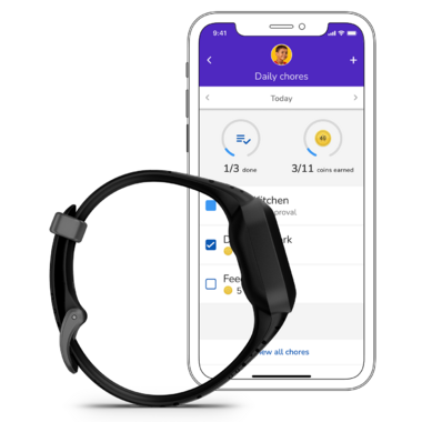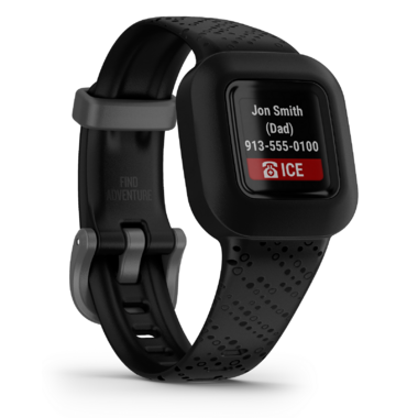 Adventure awaits your kiddos with the vivofit jr. 3 fitness tracker for kids. Featuring a colorful display and design along with unique fitness tracker display options, this kid-tough, swim-friendly fitness tracker has a user-replaceable battery that gets up to 1 year of battery life. With it, kids will have a blast exploring the different app adventures and mini games by completing 60 minutes of daily activity. Parents can use the app on their compatible smartphone to monitor steps, sleep and active minutes, manage and assign chores, set timers and even give rewards to positively reinforce good behavior. Motivate kids to keep moving with new timed activities, and even challenge friends to Toe-to-Toe step challenges. And for a little peace of mind, quickly see your child's emergency contact phone number right on vivofit jr. 3.